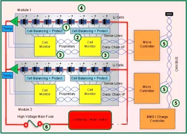 (其中,1代表對傳感器線路進(jìn)行短路保護(hù)的傳感器線路保險(xiǎn)絲;2代表電池監(jiān)測集成電路傳感器線路輸入過電壓保護(hù);3代表菊鏈I/F的過電壓/ESD保護(hù);4代表整個(gè)電池串上的高電壓TVS用于瞬變保護(hù);5代表CAN總線I/F的過電壓/ESD保護(hù);6代表用于電力線保護(hù)的高電壓/高電流保險(xiǎn)絲。)
